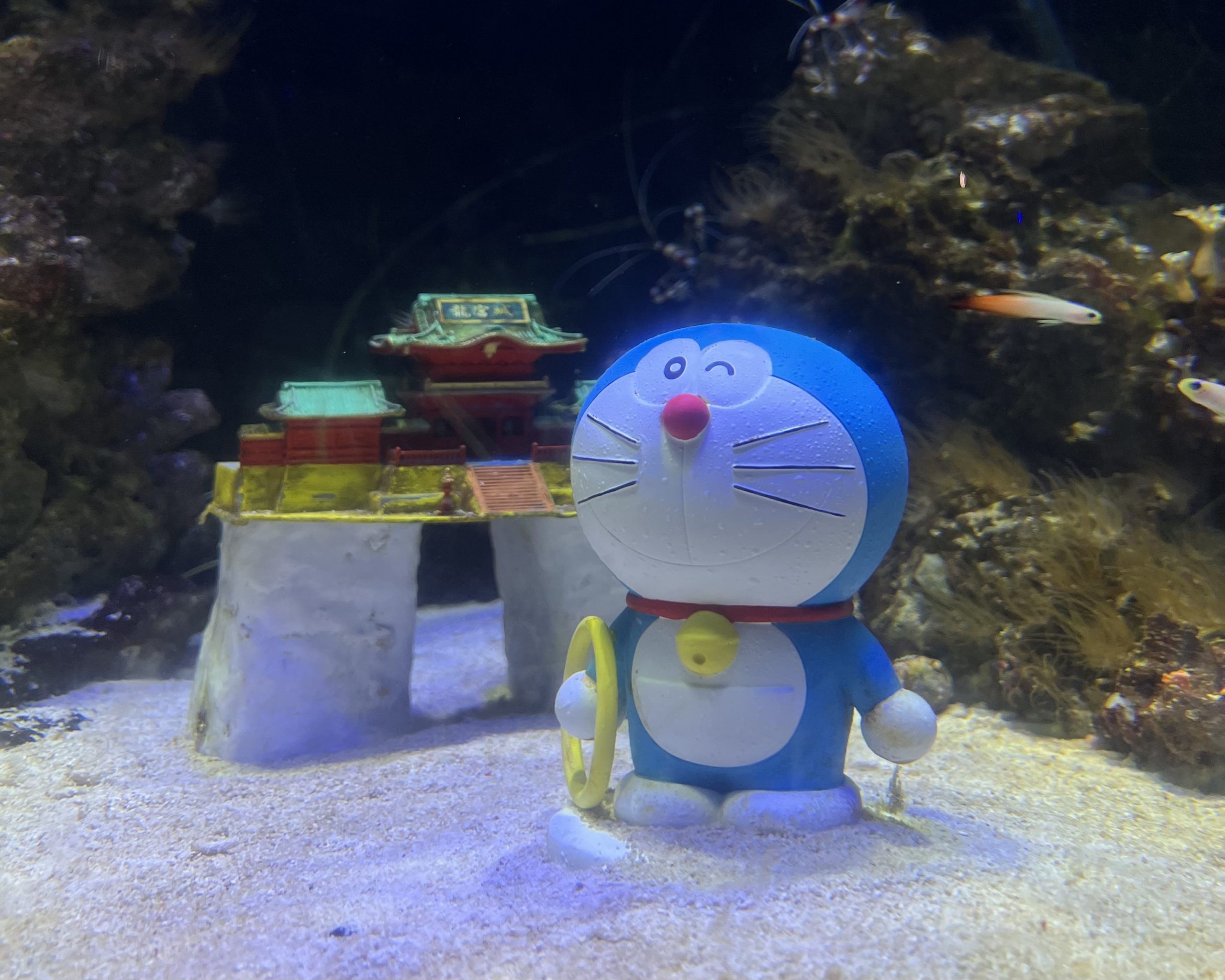 いろいろな水槽の中にお魚と一緒にドラえもんがいて、